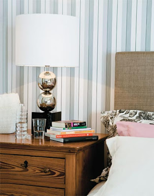 Todas as paredes do quarto decorado pelos arquitetos Fernanda Abs e Fred Benedetti foram cobertas pelo papel com faixas de tons rabeixados de preto e cinza.